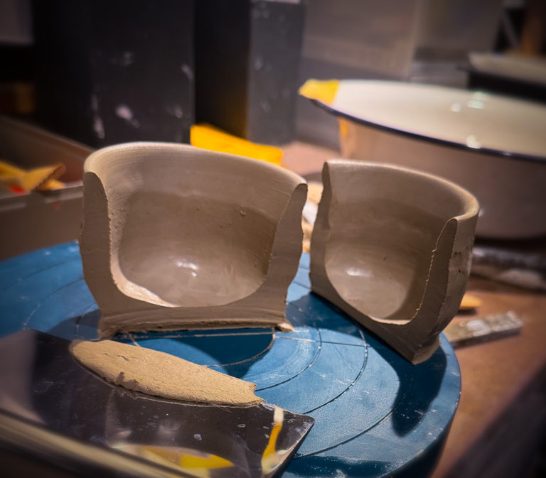 今日は陶芸教室で湯呑みの造形。 力が入り過ぎているらしく、立ち上がりが薄くなってしまう。 そして底も薄くなってしまいがち。 教室では3つ造形。来週は外側と高台の削り。 取り敢えず来週までに造形段階を100回練習する事にした。 1回目の断面がTOP画像。 厚みが均一でない上に底が薄い。 サイズを測っていませんでしたが次回からサイズを決めて作ります。 今日作成分は直径7.5cm高さ6cm 続きは明朝。