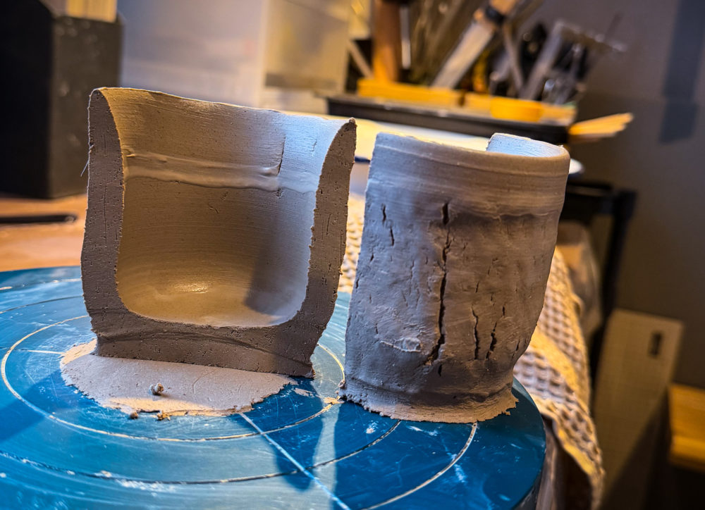 コテに対して気持ち小さい直径に半ば強引にコテを入れて内側を均したら外側に盛大にヒビが入った。前日夜に土練して作った玉を使用したから粘土が固くなっていたのも原因かも知れない。