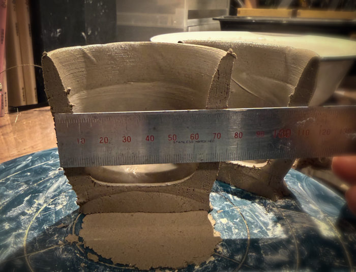 コテに対して気持ち小さい直径に半ば強引にコテを入れて内側を均したら外側に盛大にヒビが入った。前日夜に土練して作った玉を使用したから粘土が固くなっていたのも原因かも知れない。