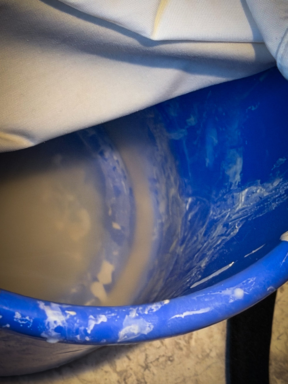 しっかり濾過され、粘土が布に1-2mm厚で残っている。