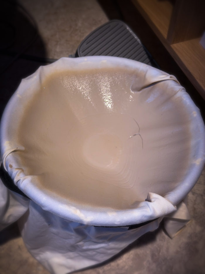 しっかり濾過され、粘土が布に1-2mm厚で残っている。